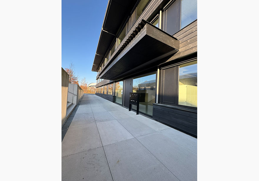 Die hybride Bauweise kombiniert ein Stahlbetonskelett mit einer massiven Holzfassade aus pigmentiertem Tannenholz.