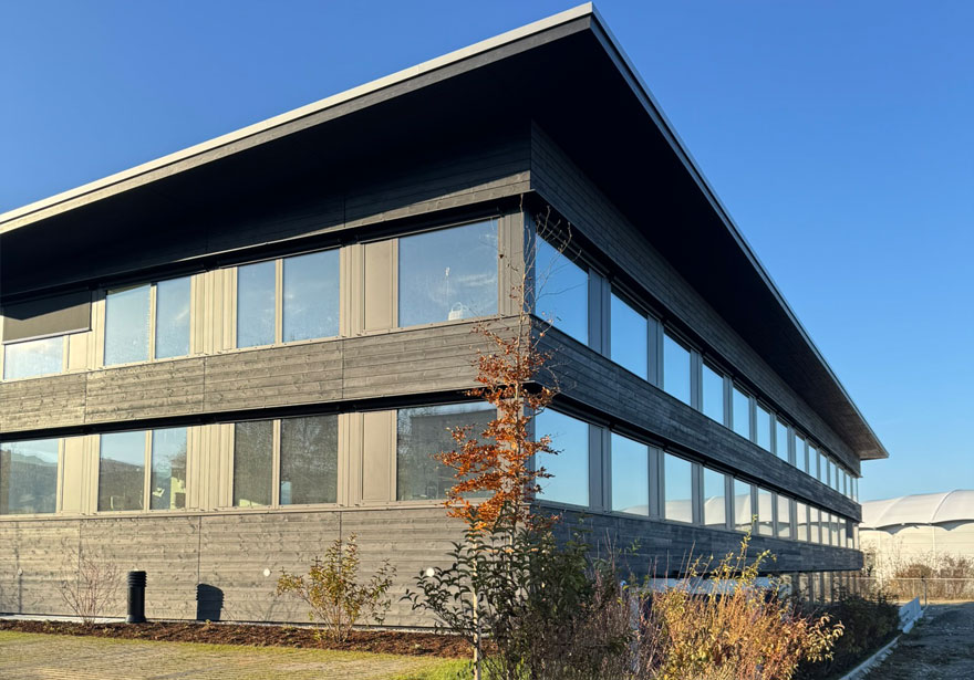 Die hybride Bauweise kombiniert ein Stahlbetonskelett mit einer massiven Holzfassade aus pigmentiertem Tannenholz.