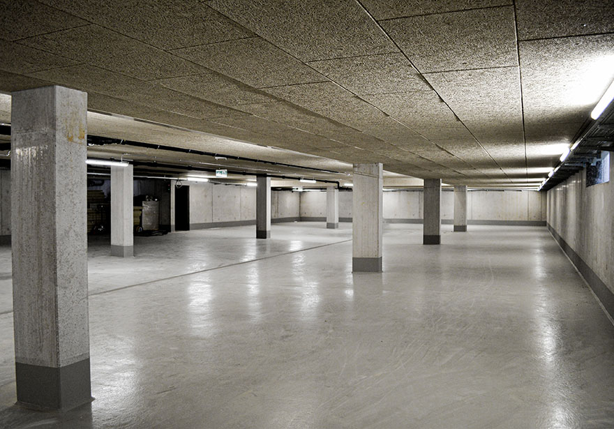 Die Räume verfügen über Hohlraumböden für flexible Leitungsführung, Trockenbauwände zur variablen Raumaufteilung und eine reduzierte, funktionale Gestaltung. Großzügige Fensterflächen sorgen für Tageslicht, während elektrisch gesteuerte Rollos und umlaufende Vordächer Sonnen- und Sichtschutz bieten. Die natürliche Belüftung erfolgt über öffenbare Fensterflügel. Ein zentraler Gebäudekern mit Treppenhaus und Aufzug ist statisch und räumlich auf ein Minimum reduziert – das erhöht die Flexibilität der Nutzung. Neben Sanitäreinheiten sind auch Technikräumen in die Kernstruktur integriert.